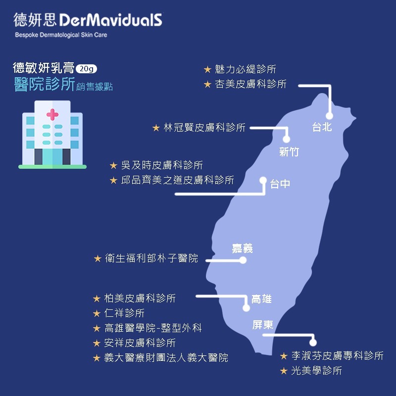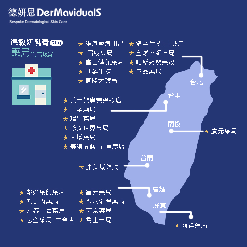 德敏妍乳膏 Deflusone DMS Cream 20g 全台銷售據點 醫院/診所/藥局 皆有販售 本藥須由醫師開立處方使用,請持處方箋至各大銷售據點購買 緩解肌膚乾癢 問題肌膚適用 各大醫療院所推薦 就近聯絡資訊 請洽: 0800-722-333 更多銷售據點資訊