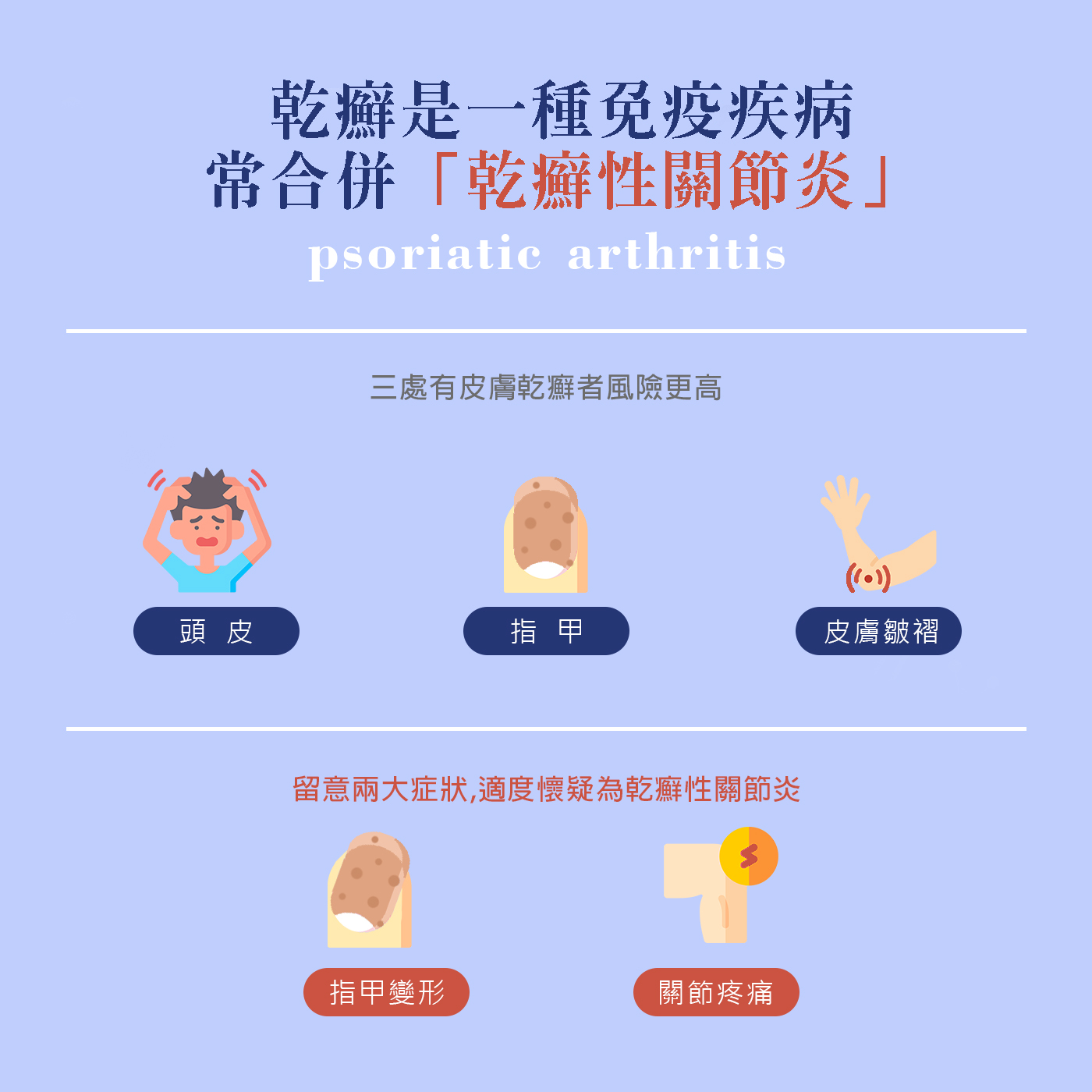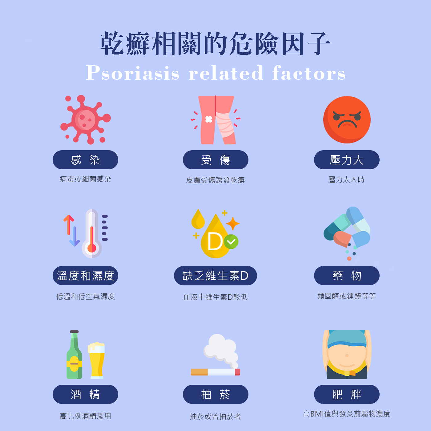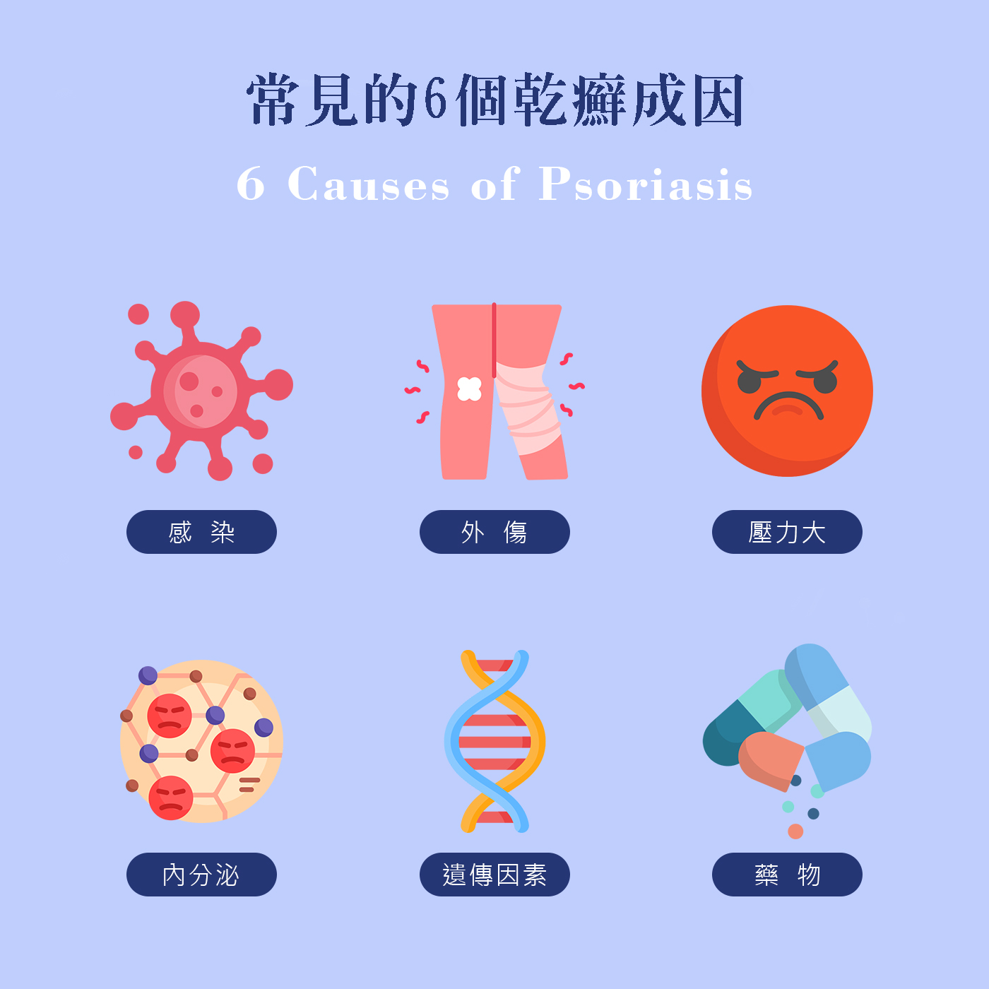 - 壓力:若壓力太大也容易造成乾癬病情。